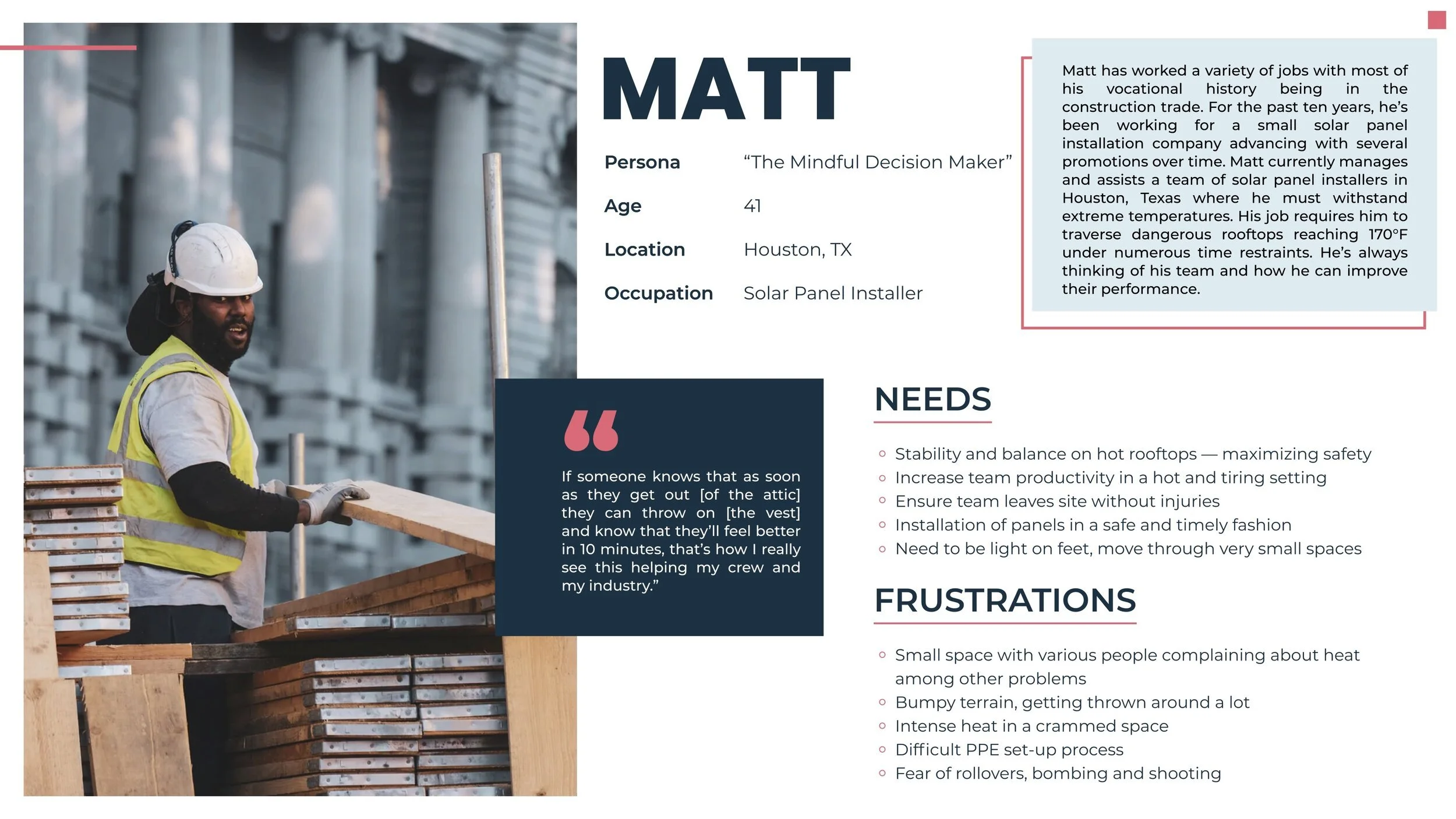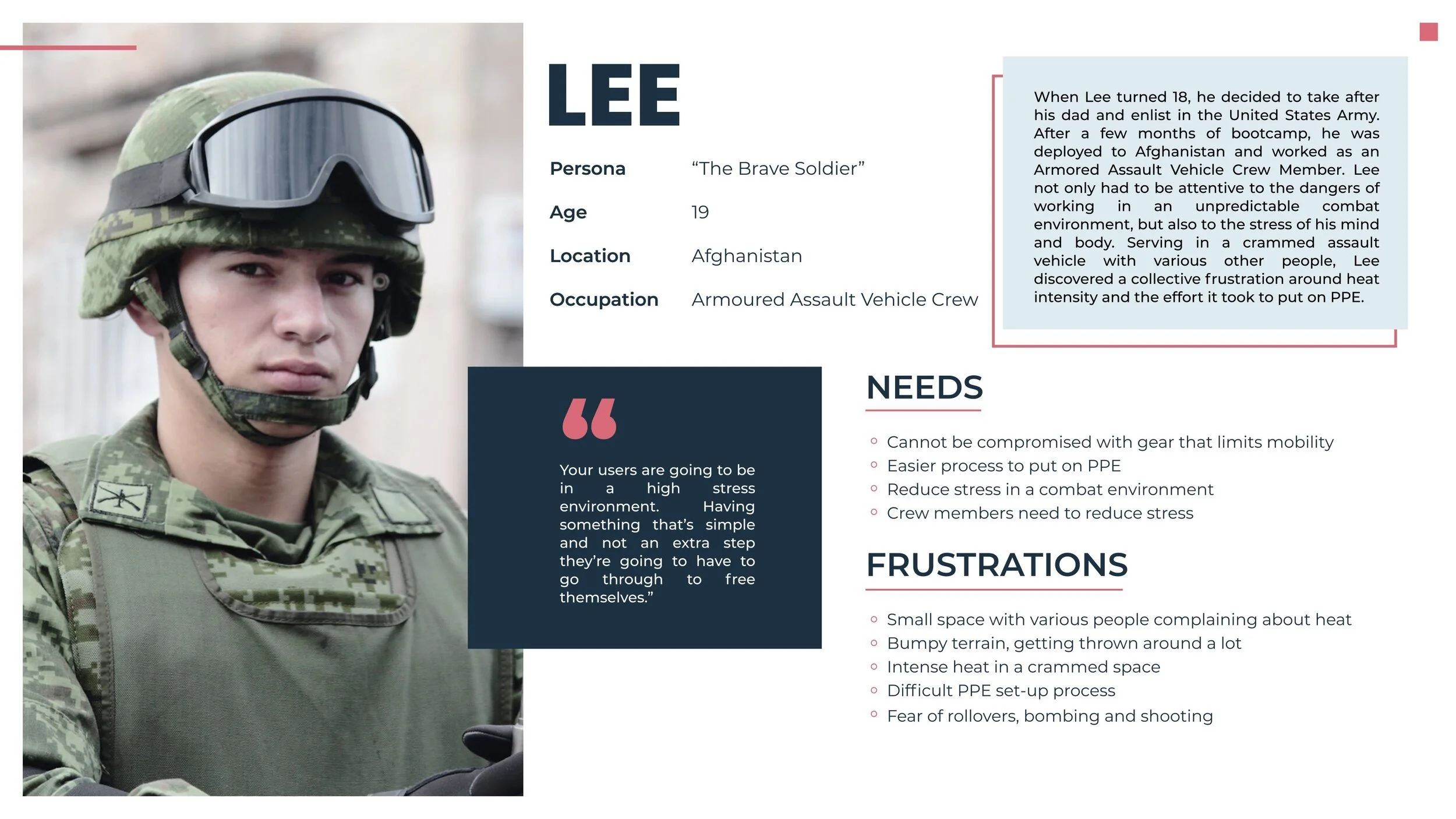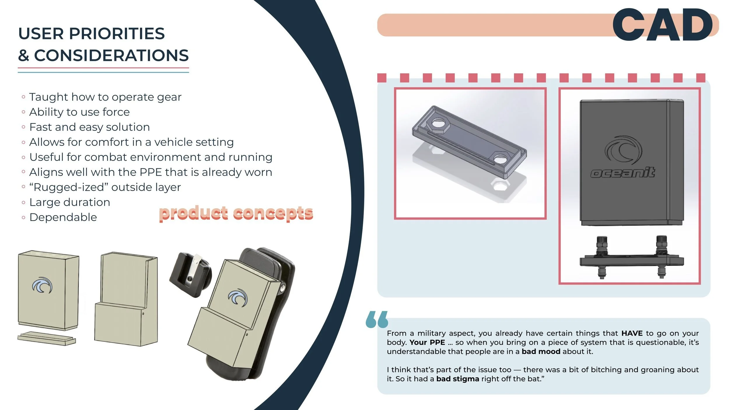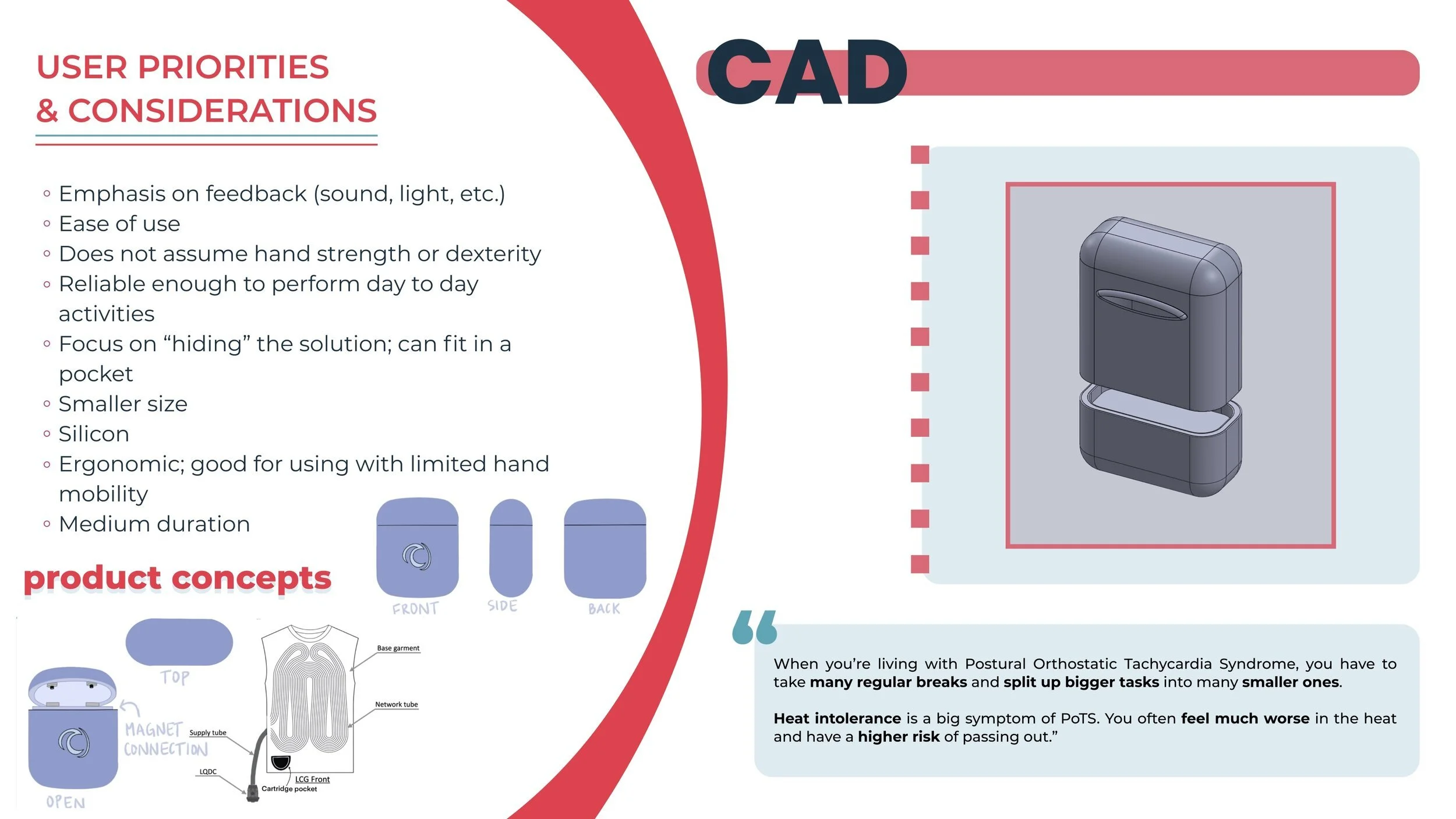 As a team of designers, we created combined the learnings from a variety of user interviews and investigations. The guide evaluates the needs of four distinct user personas, and proposes a most fitting version of the SCV. In these cases, the vest remains the same, and the liquid cartridge that contains the coolant changes in form and attachment.
