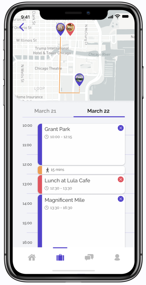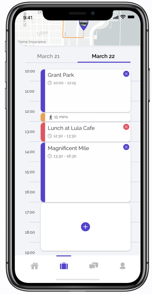 User views day-by-day overviews of their chosen itinerary, with the order of events displayed on the map above. The user is able to move the events in a drag-and-drop manner. Additionally, a user can choose to fill up available time with suggested activities based on the time frame and area.