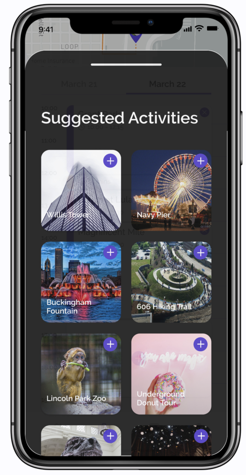 Our goal was to allow users flexibility to create and plan itineraries based on their own priorities, whether it be cost-efficiency, maximizing time seeing sites, minimizing travel time, etc. Users input their cost, transit, and active daily time. From there, they can add activities from various categories, and we will provide various itinerary options with different priorities. From there, users can view their daily activities on a map, move around the events, add new activities, and find nearby restaurants.