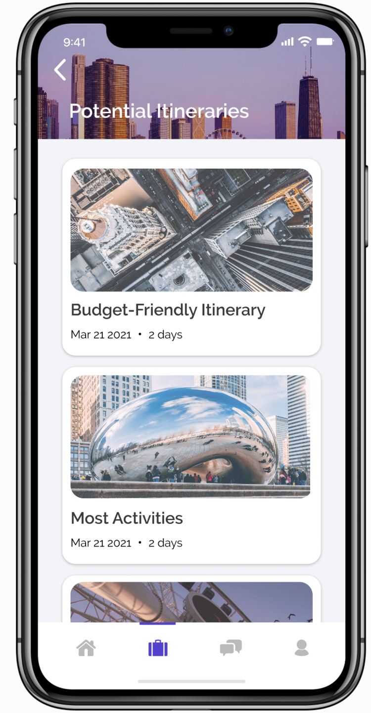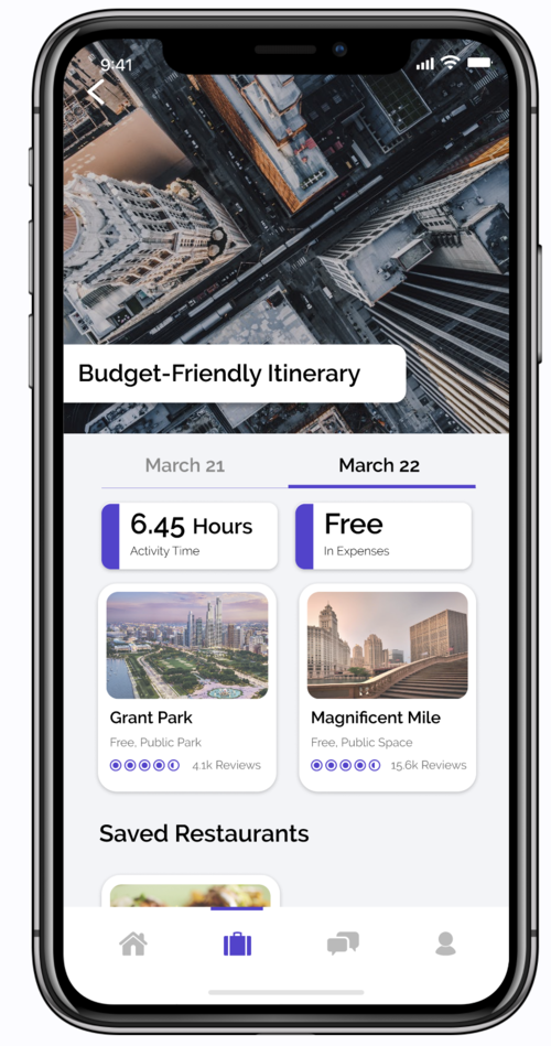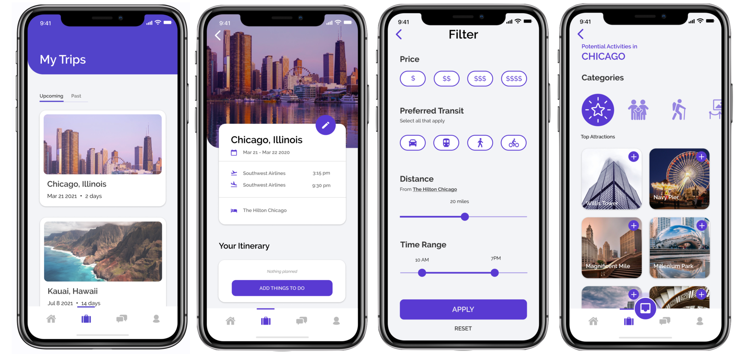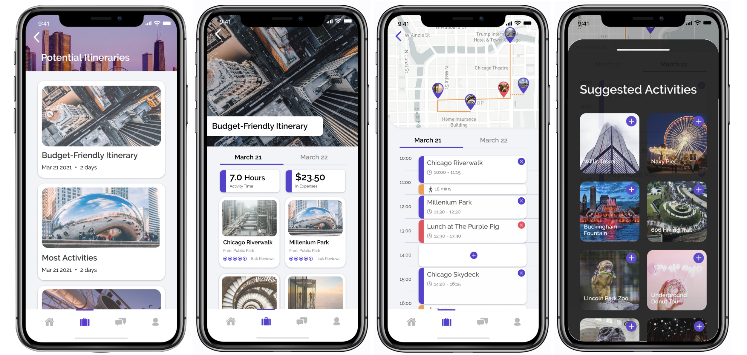The user is able to input their needs and priorities at various stages. First, the Filter tool allows the user to choose their price range, modes of transit, desired distance from a “home base” (i.e. a hotel), and daily active time. After selecting activities, the user is shown various generated itineraries. Each itinerary is optimized for different goals, including price and number of activities. The user is able to explore each itinerary and choose their desired plan.