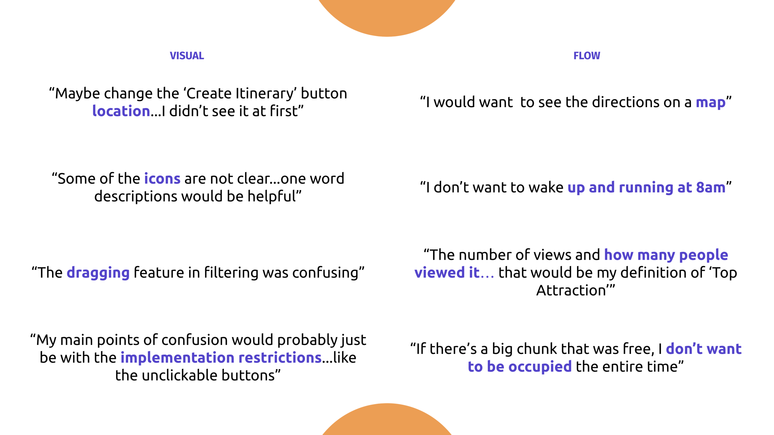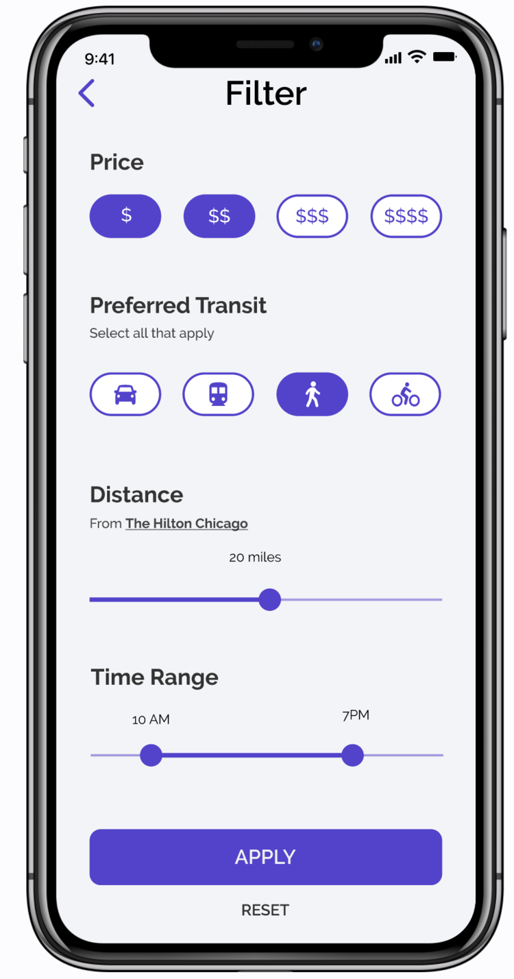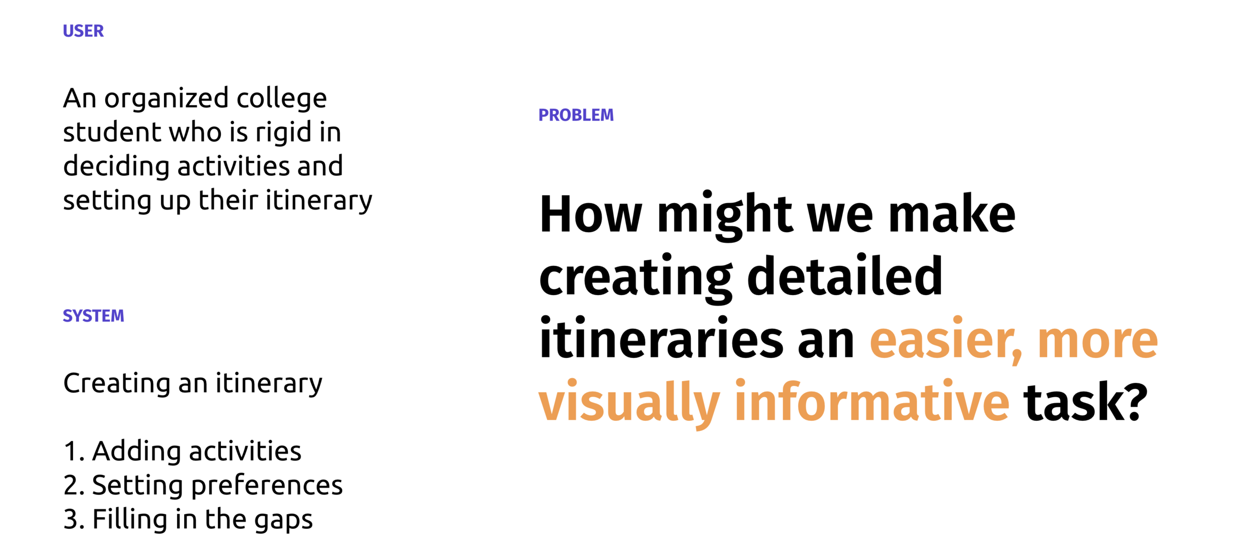 The user is able to input their needs and priorities at various stages. First, the Filter tool allows the user to choose their price range, modes of transit, desired distance from a “home base” (i.e. a hotel), and daily active time. After selecting activities, the user is shown various generated itineraries. Each itinerary is optimized for different goals, including price and number of activities. The user is able to explore each itinerary and choose their desired plan.