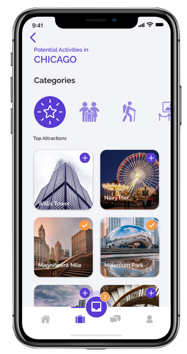 Users can browse activities of various categories in their region of interest. Here, users can click on each activity to learn more, or can quickly click the + to add to their list of desired activities. Below, the user sees the number of selected activities before moving to choosing an itinerary.