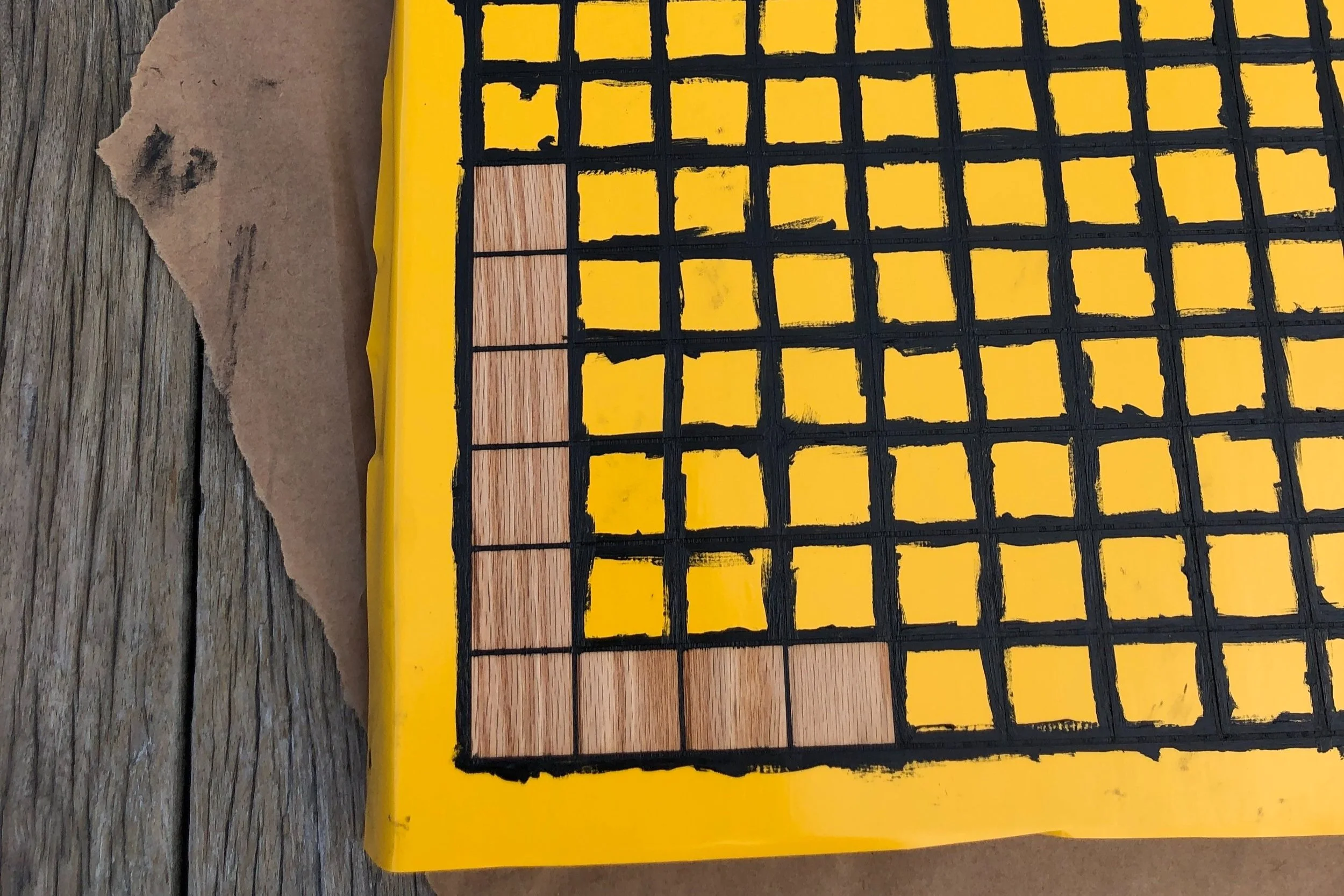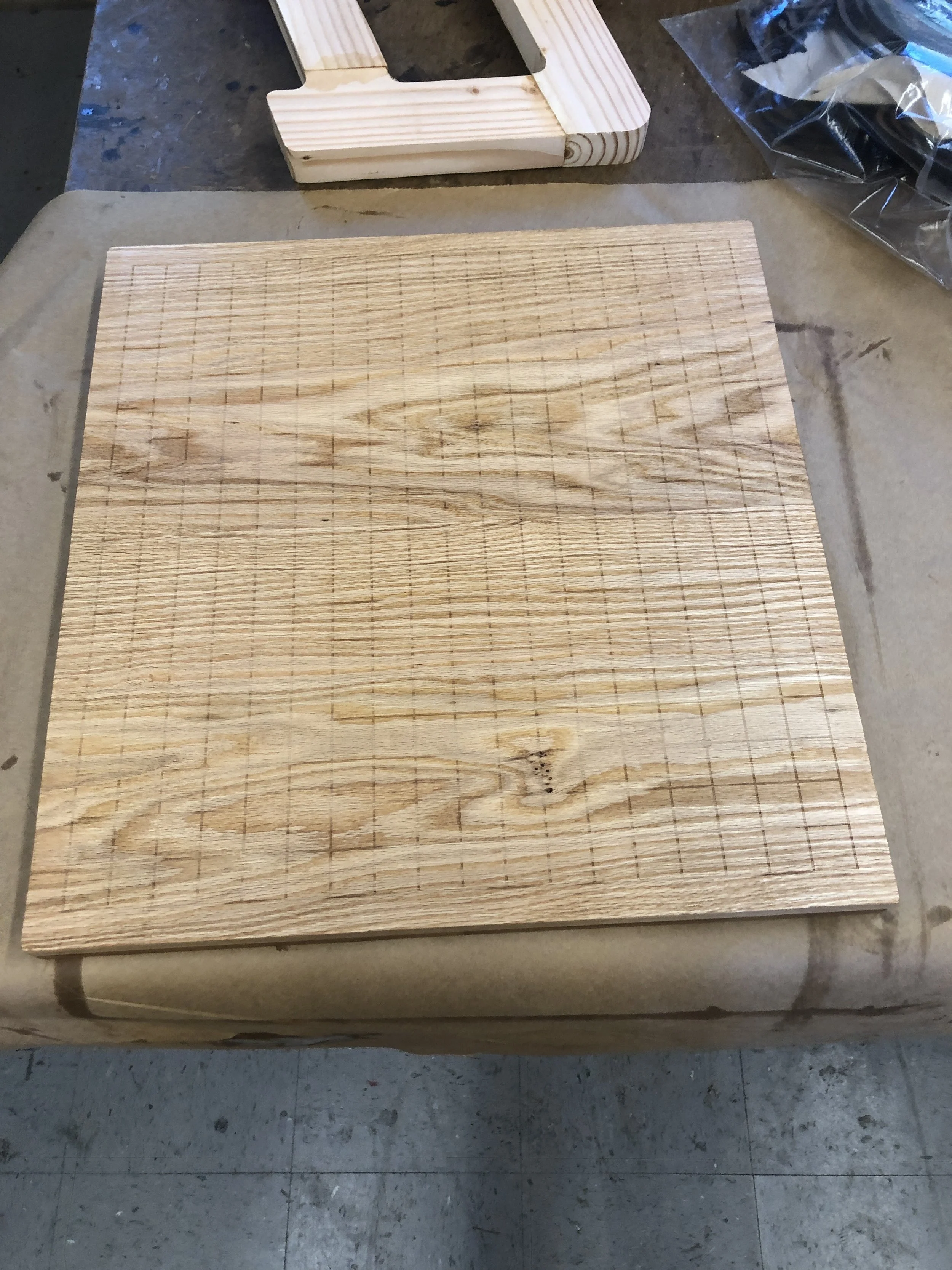 The largest challenge of this project was creating the bold symmetrical lines and circles that are critical to Go. Painting by hand would result in asymmetries that would be unappealing, so I first tried to create indentations for paint to sit into using various passes of engraving on a laser cutter. The goal was to paint the lines loosely, and sand the top surface to reveal clean lines. However, I found that the path of the laser is relatively not uniform, creating uneven depths along the lines. This meant that some sections would be so minimally recessed that they would be sanded away after painting.