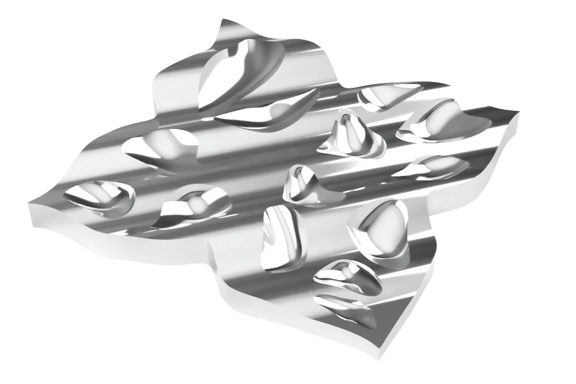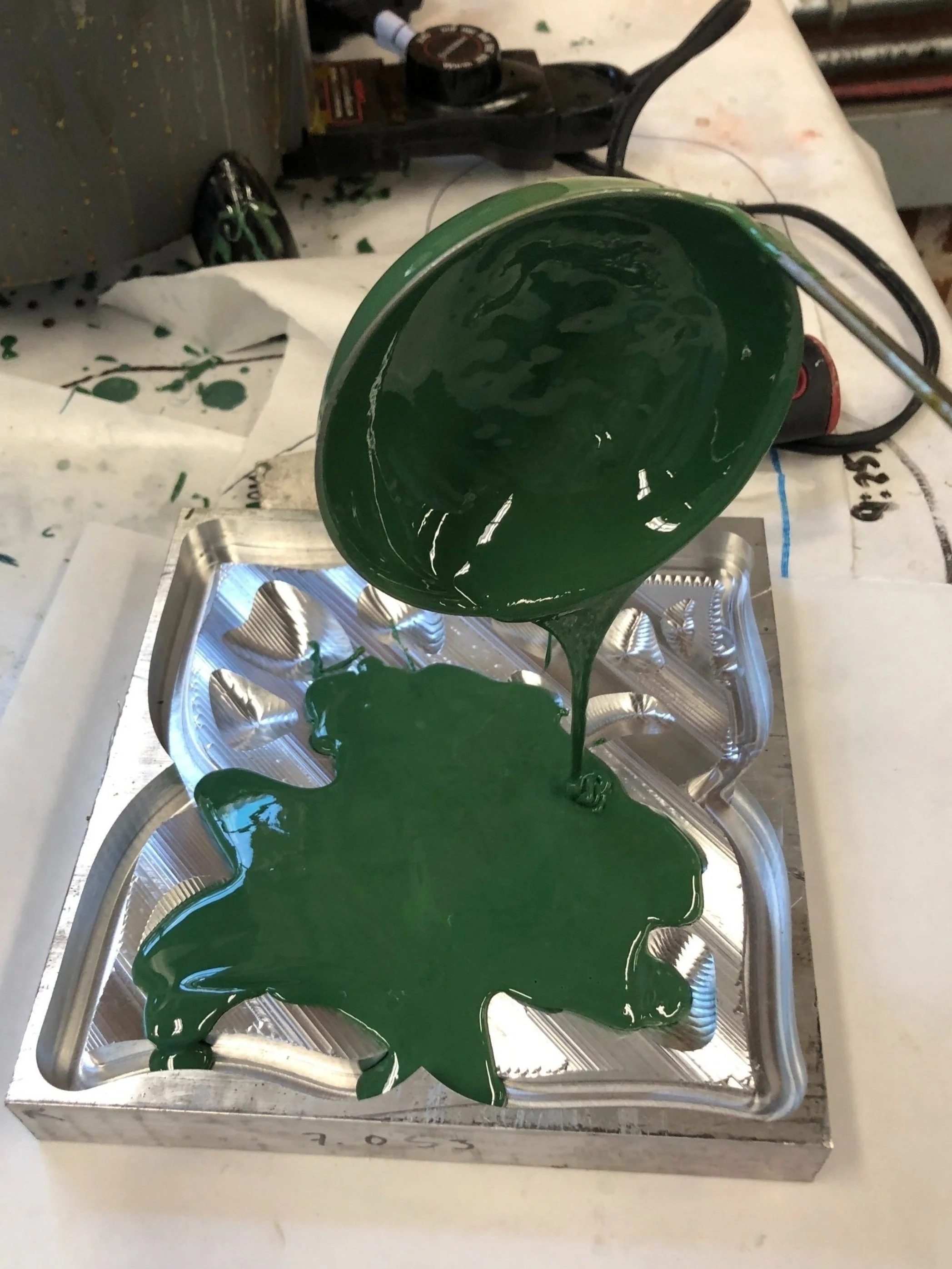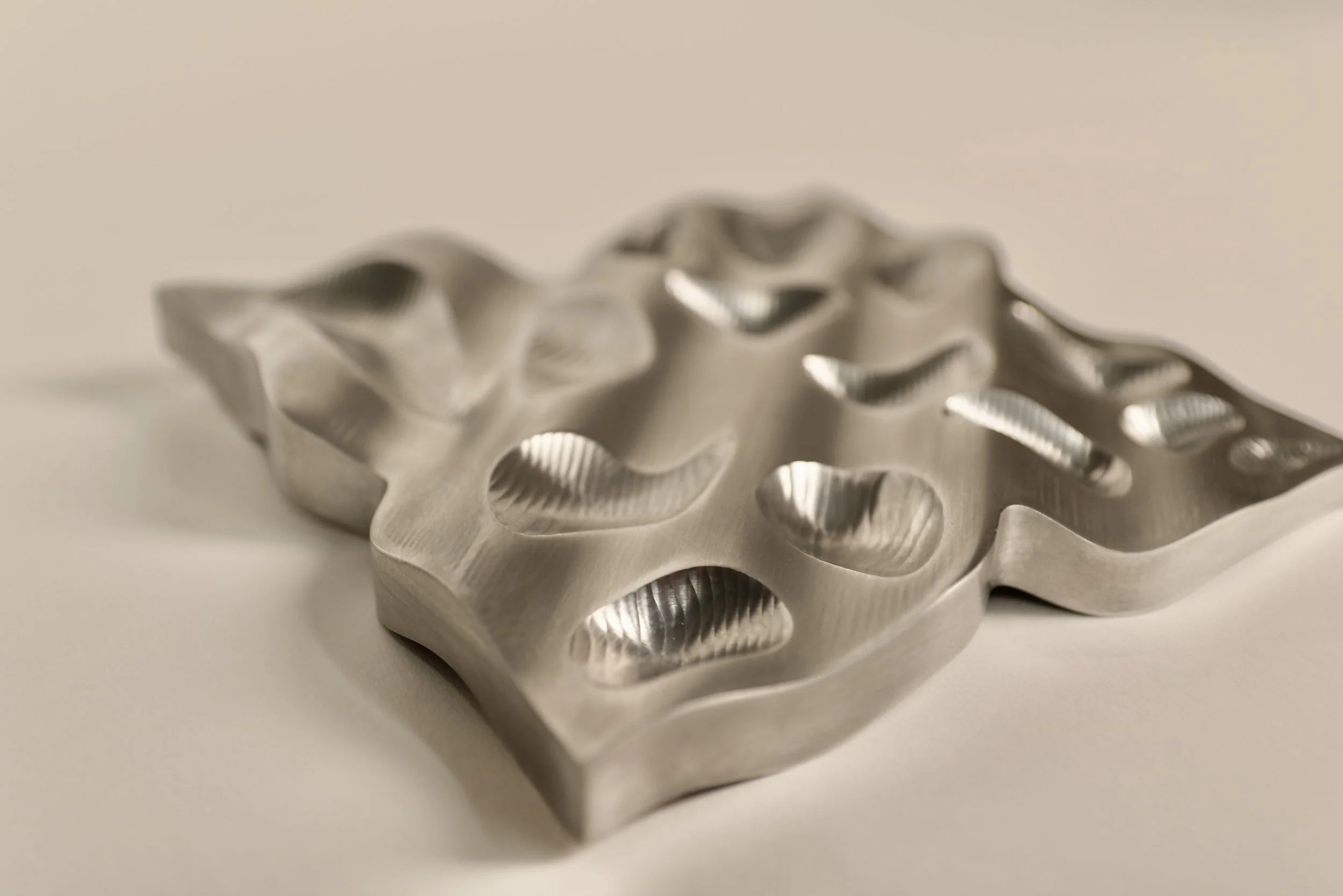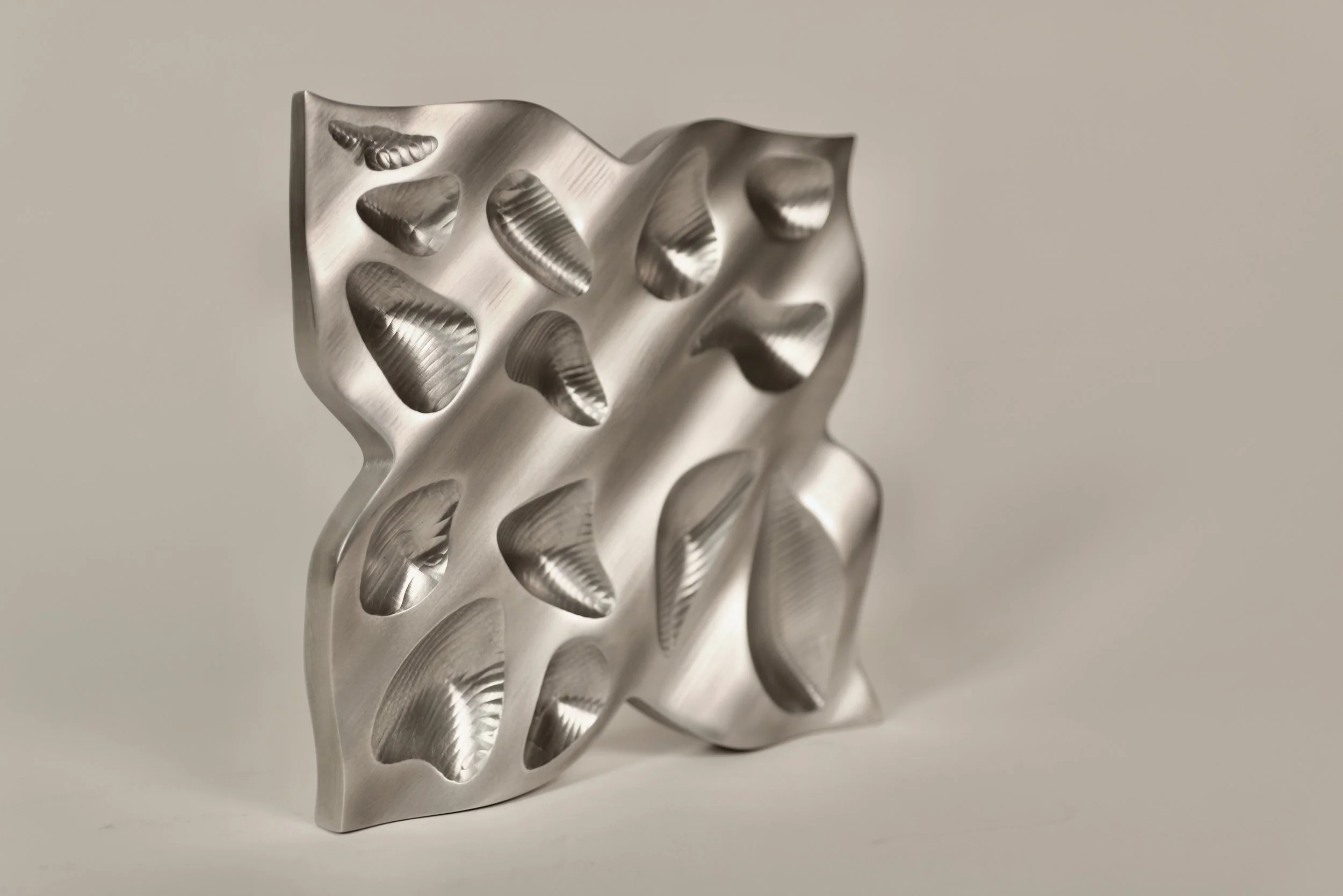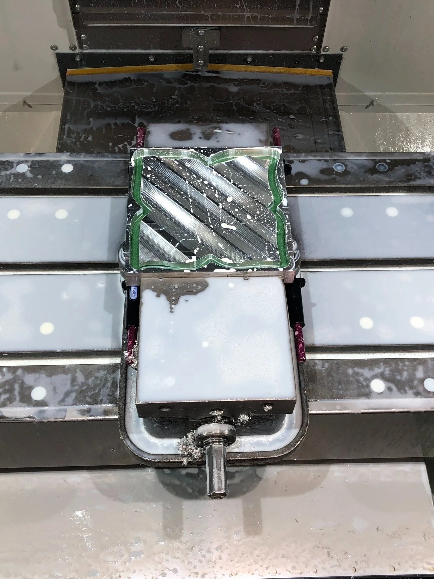 To machine the second half of the part and release it with smooth exterior lines, I filled the first side with wax. The wax would then provide support lost by the metal that was machined away on the first side, so that the part could support itself while machining the second side. First, the wax was removed using a shell mill, and then the part was flipped, being cautious to enture coordinate systems were correctly aligned. The second side of machining started by creating the flowing top surface, again using a parallel finishing pass, and ended by cutting a pocket along the exterior lines to release the part.