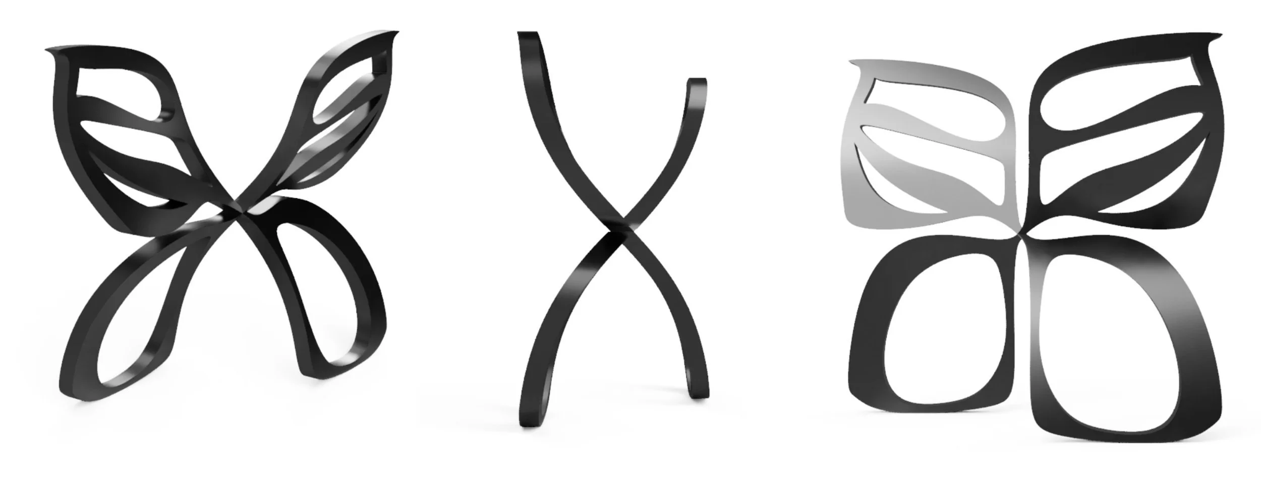 Of all the ideas, the concept of the butterfly most stood out to me. In my family, the butterfly represents the passing of a loved one, and focuses on the fleeting moments where we can feel connected to someone far away. I pursued this idea through a two-piece sculpture, where each piece incldued the diagonal wings and would cross over each other. Each part, when separate, is an interesting organic shape without clear meaning. When together, the parts relate to each other in space such that the butterfly form is conveyed. For this concept, I explored a variety of considerations, including how to hold the parts up, the orientations of the wings, and their geometries in three axes. The most favored concept was modeled in Fusion 360.